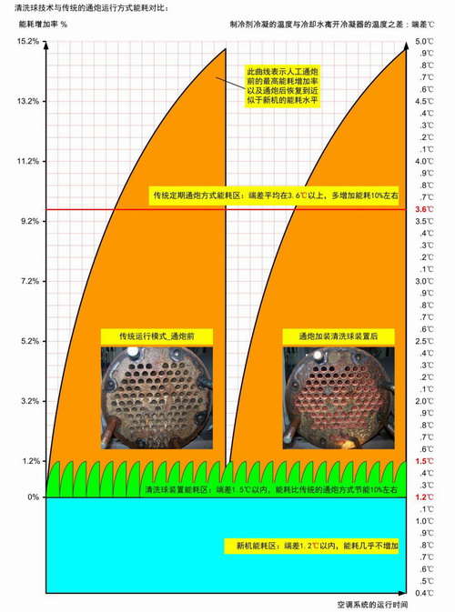 3、在校核冷水機(jī)組冷卻水進(jìn)、出口管路上的溫度計(jì)精確度,以及冷水機(jī)組冷凝器冷凝溫度的精確度之基礎(chǔ)之上,安裝FC-CACS系統(tǒng)后:用化學(xué)清洗或機(jī)械式毛刷清洗捅炮機(jī)清洗冷凝器換熱管內(nèi)壁,確認(rèn)換熱管內(nèi)壁潔凈無污垢后,在電流百分比為100%及額定工況下運(yùn)行,清洗系統(tǒng)正常使用時(shí),溫度端差(小溫差)△t的增加量不大于0.3℃±0.1℃,也就是說安裝完FC-CACS在線清洗系統(tǒng)后冷凝器的端差(小溫差)應(yīng)該控制在1.5℃之內(nèi)。