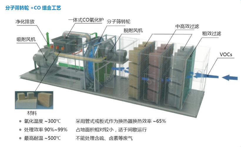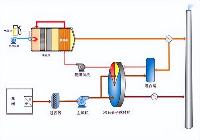 VOCs 的種類繁多、成分復(fù)雜、性質(zhì)各異,在很多情況下采用一種凈化技術(shù)往往難以達(dá)到治理要求,而且也不經(jīng)濟(jì),在處理大風(fēng)量、低濃度的廢氣燃燒和回收的時(shí)候,如果沒有沸石轉(zhuǎn)輪,直接進(jìn)行燃燒的情況下,廢氣處理設(shè)備不僅體和龐大,而且產(chǎn)生的運(yùn)行費(fèi)用也會很龐大,因此,在有機(jī)廢氣治理中,采用兩種或多種凈化技術(shù)的組合工藝近年來得到了迅速發(fā)展,沸石轉(zhuǎn)輪吸附濃縮技術(shù)就是針對低濃度VOCs 的治理而發(fā)展起來的一種新技術(shù),與焚燒技術(shù)(催化燃燒或高溫焚燒)或冷凝技術(shù)進(jìn)行組合,形成了滿石轉(zhuǎn)輪吸附濃縮+焚境技術(shù)”和“沸石轉(zhuǎn)輪吸附濃縮+冷凝回收技術(shù)”。沸石轉(zhuǎn)輪是將大風(fēng)量、低濃度的廢氣濃縮到高濃度、小風(fēng)量的廢氣,從而減少設(shè)備的投入費(fèi)用和運(yùn)行成本,提高VOCs廢氣的高效率處理。利用不同單元治理技術(shù)的優(yōu)勢,采用組合治理工藝,不僅可以滿足排放要求,而且可以降低凈化設(shè)備的運(yùn)行費(fèi)用。