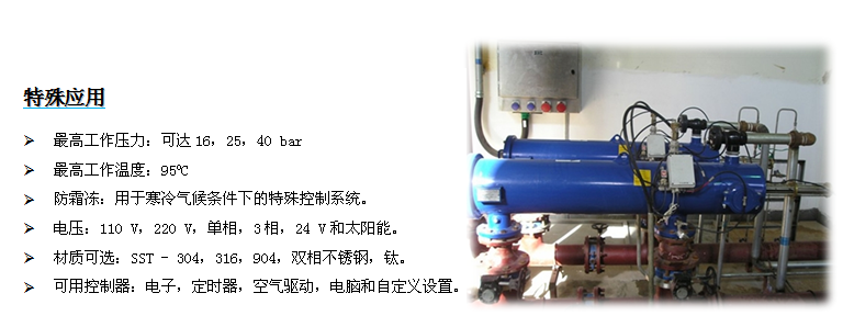 具有時(shí)間清洗功能(由運(yùn)營商預(yù)設(shè)),確保在壓力損失沒有達(dá)到預(yù)設(shè)值的情況下,沖洗自動(dòng)的進(jìn)行。
